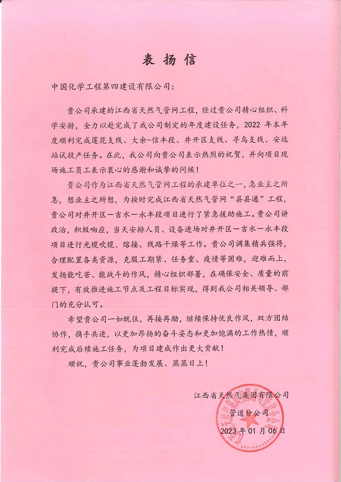 江西省天然氣集團有限公司管道分公司給華北公司發(fā)來表揚信