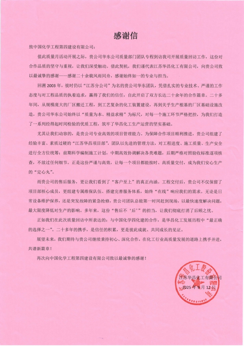 近日,在全國“質量月”活動開展之際,華東公司收到江蘇華昌化工有限公司發(fā)來的感謝信。這份滿載認可的信函,不僅是合作方對華東公司質量管理工作的高度肯定,更成為雙方20余載風雨同舟、攜手共進的深厚合作情誼的生動見證。