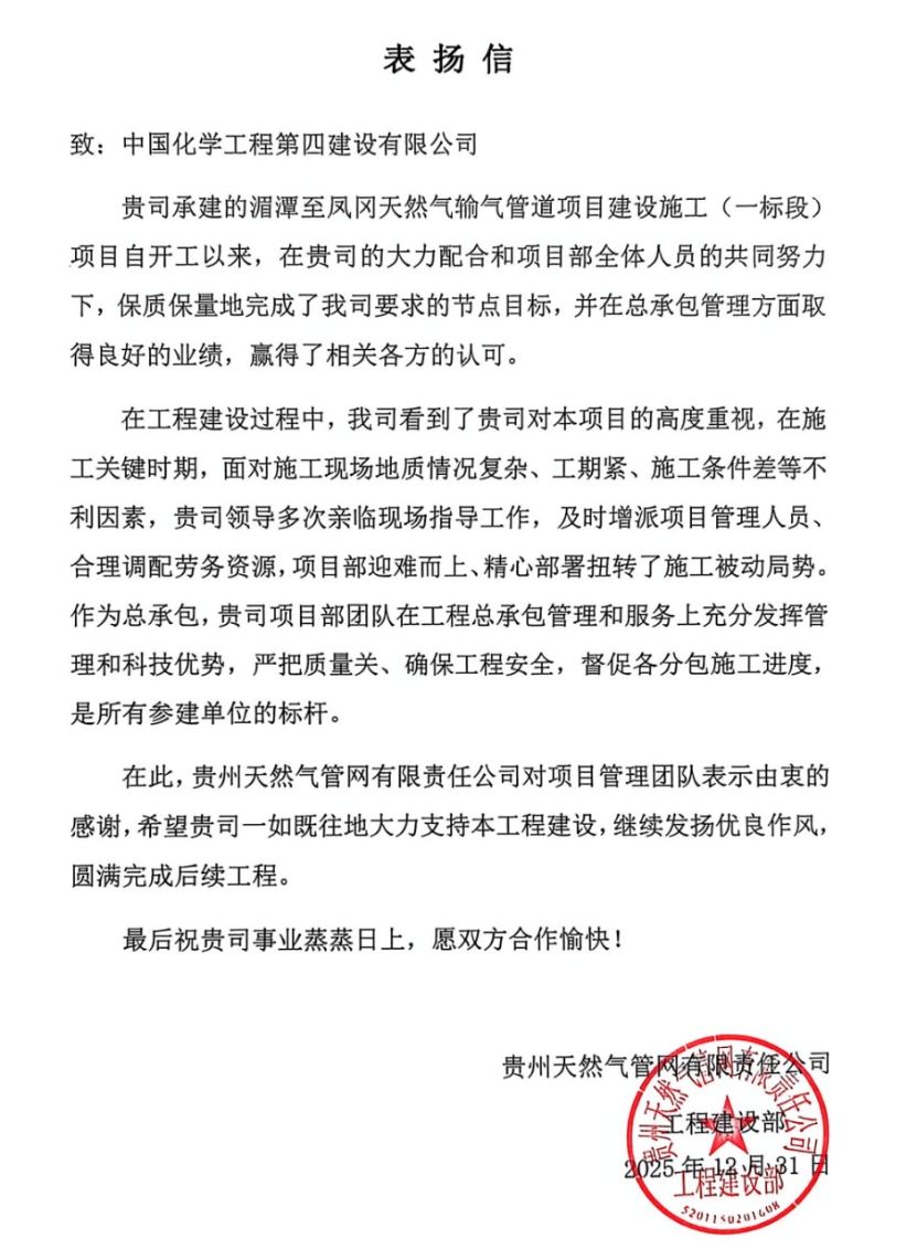 近日,由西部公司承建的湄潭至鳳岡天然氣輸氣管道項目收到貴州天然氣管網有限責任公司發來的表揚信,對項目團隊保質保量完成節點目標、在總承包管理方面取得的良好業績給予高度評價。