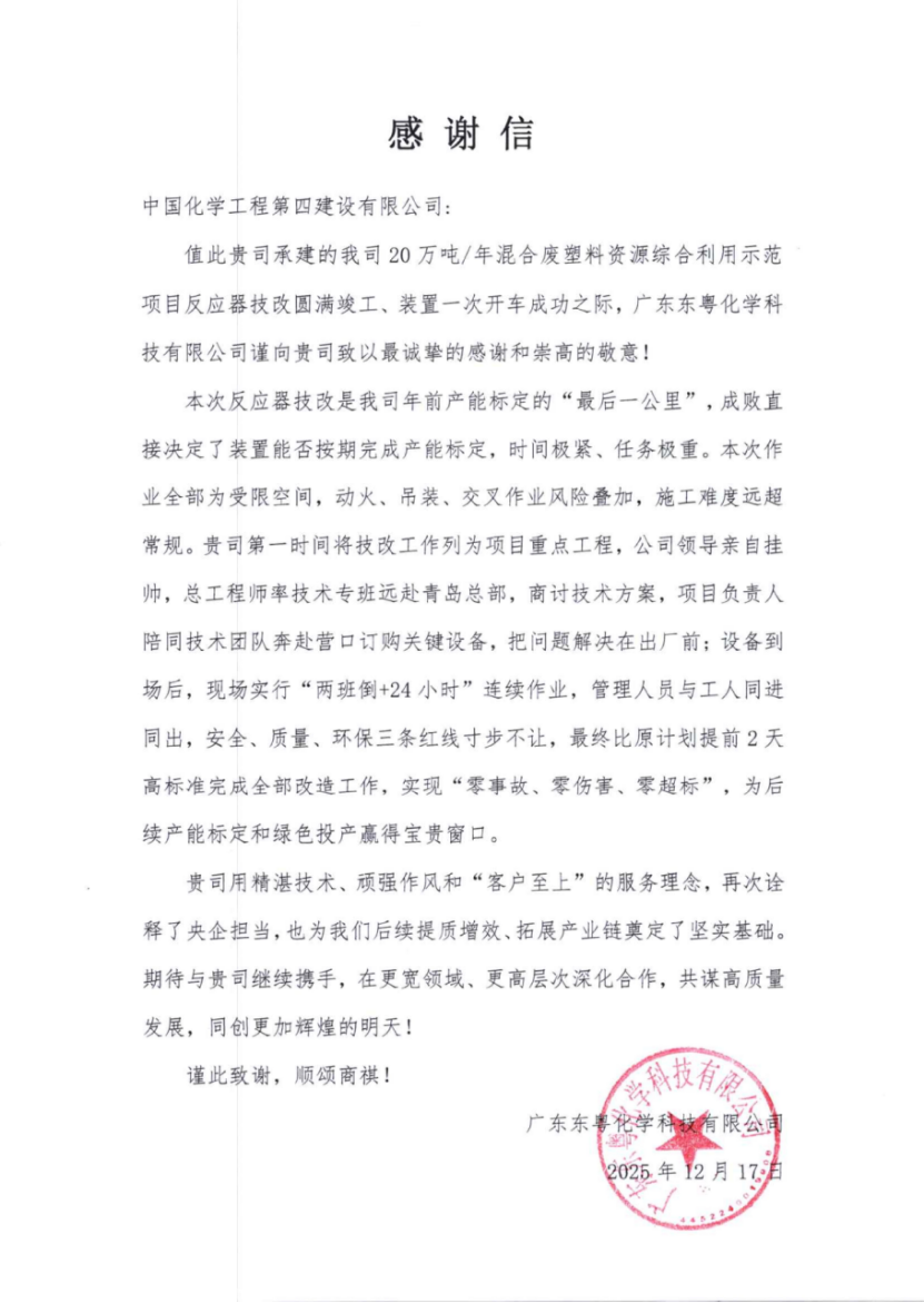 近日,華南公司收到廣東東粵化學科技有限公司發來的感謝信,對華南公司在20萬噸/年混合廢塑料資源綜合利用示范項目反應器技改工程中的出色表現給予高度評價,并對項目團隊展現出的專業水準、過硬作風與“客戶至上”的服務理念表示誠摯感謝。