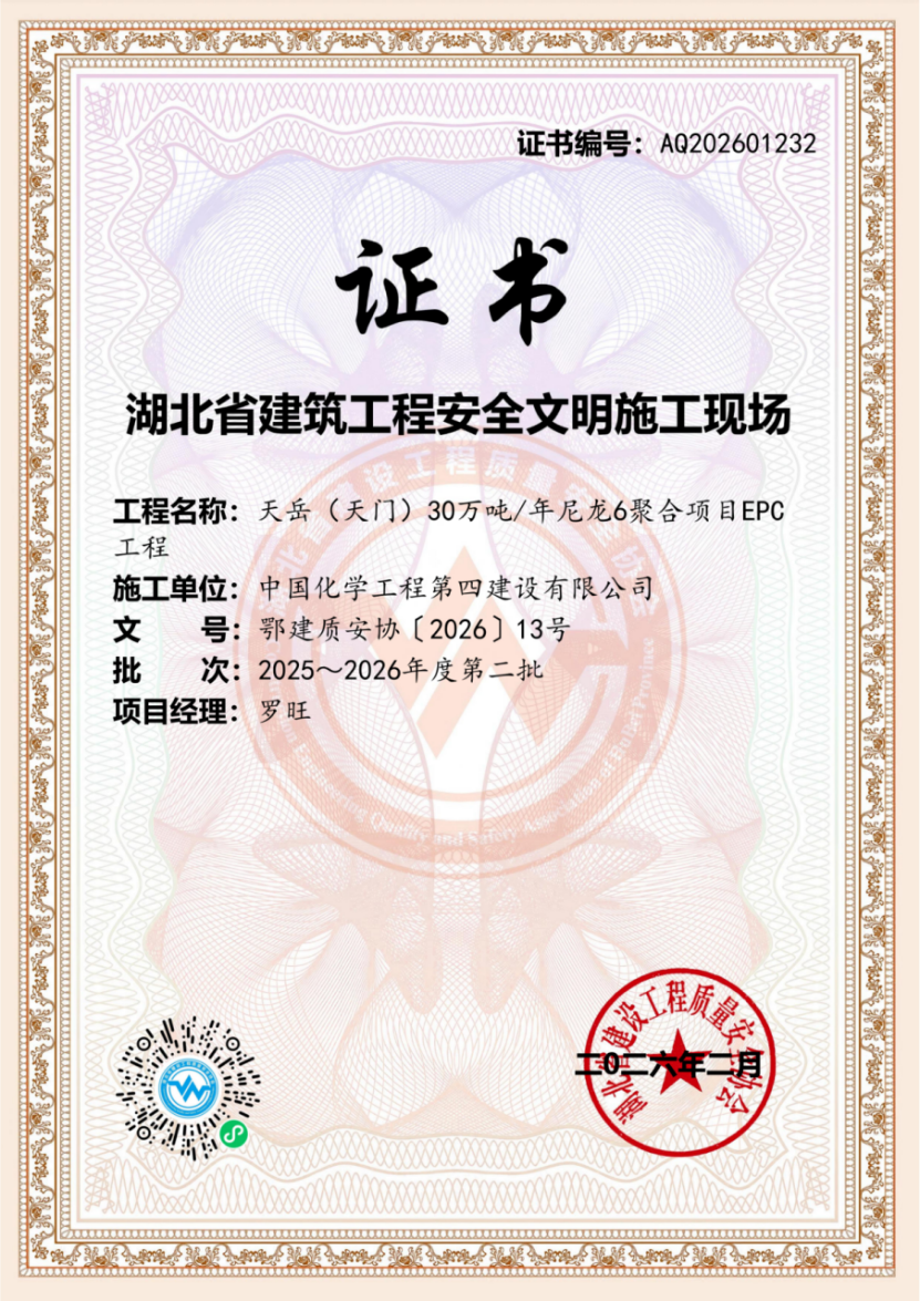 近日,2025—2026年度第二批湖北省建筑工程安全文明施工現場評選結果正式公布,由西南公司承建的天岳(天門)30萬噸/年尼龍6聚合項目成功入選,標志著項目在安全管理、文明施工及現場規范化建設方面達到省級領先水平。