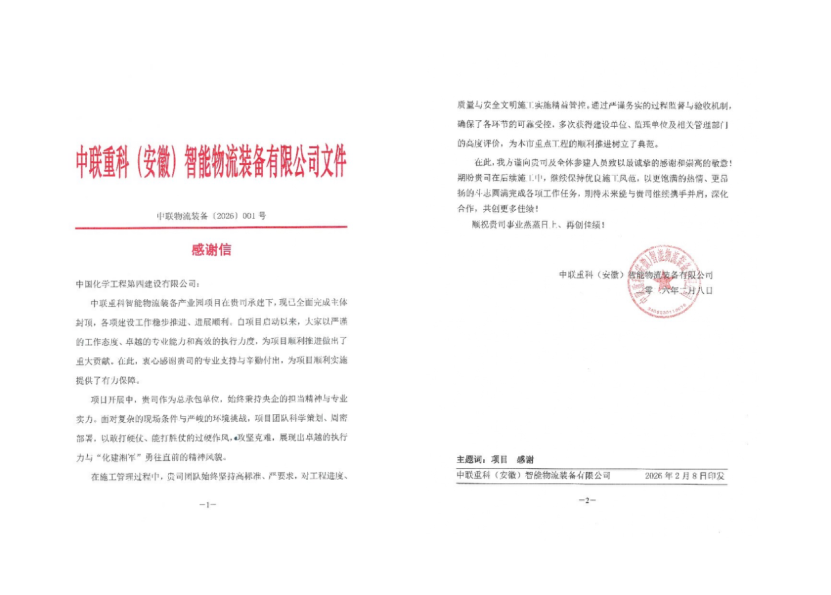 近日,建筑工程公司收到中聯重科(安徽)智能物流裝備有限公司發來的感謝信,信中對分公司在中聯重科智能物流裝備產業園項目建設中的優異表現給予高度贊譽。該感謝信被業主列為開年一號文件,充分體現了對項目團隊的高度認可。